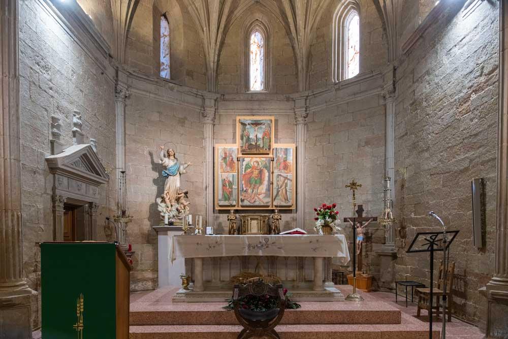 Esta Parroquia Colegiata dedicada a Santa María la Mayor (siglo XVI). Se trata de una de las más bellas y armónicas construcciones del gótico rural tardío aragonés que se distingue de sus contemporáneas por ser la única del Somontano de planta de cruz latina, una sola nave, planta de cruz latina que alberga un bonito retablo del siglo XVI representando a San Miguel.